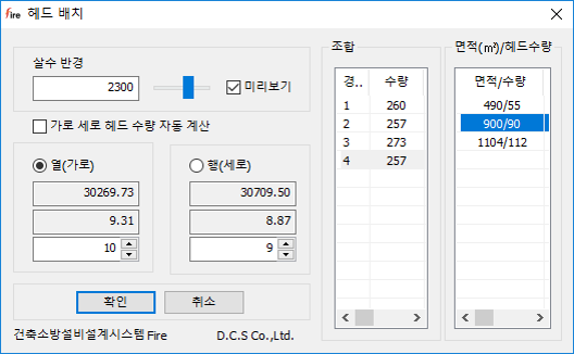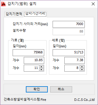 사용자가 지정한 범위 내에서 감지기의 감지 면적 또는 감지기간 간격에 의해 최적의 감지기 수량이 계산되어 결정되며, 사용자의 입력에 의해 수량을 조정하여 배치 가능하다.